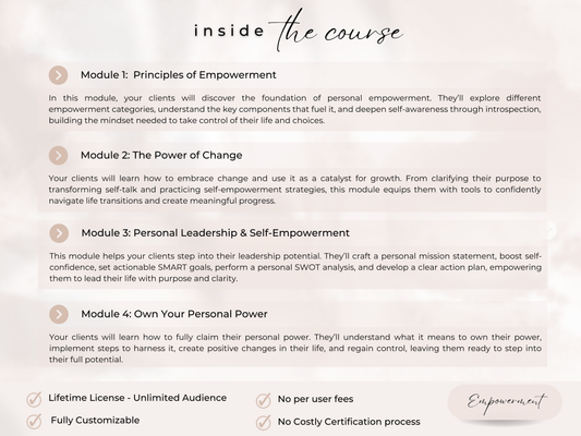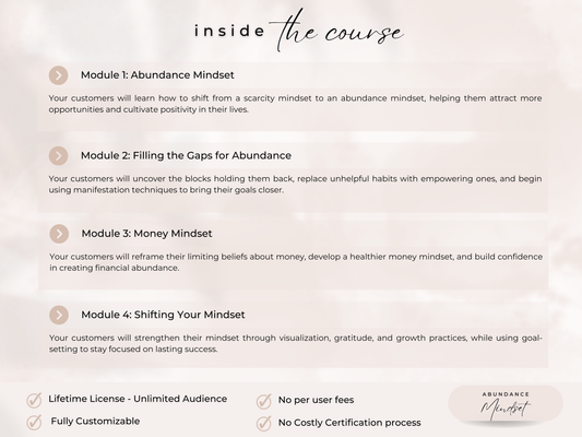 PLR (Private Label Rights) products are pre-written, customizable materials that you can edit, brand, and use as your own. With our PLR courses and resources, you have the flexibility to add your personal touch, adapt the content to fit your coaching style, and deliver it to your audience under your brand. This saves you time on content creation while allowing you to focus on growing your business and providing value to your clients.