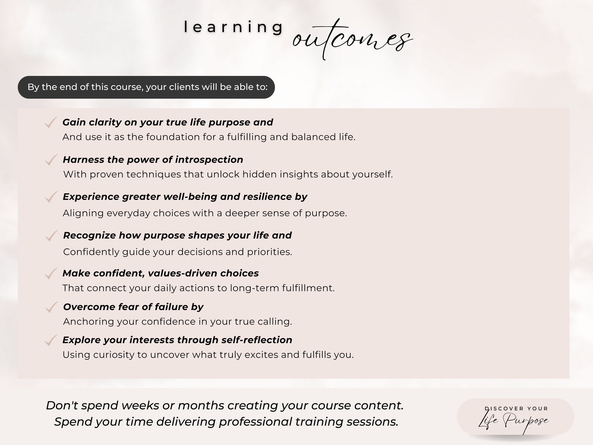 - This course gives participants the clarity and confidence they need to make purposeful decisions and live a life aligned with their passions.