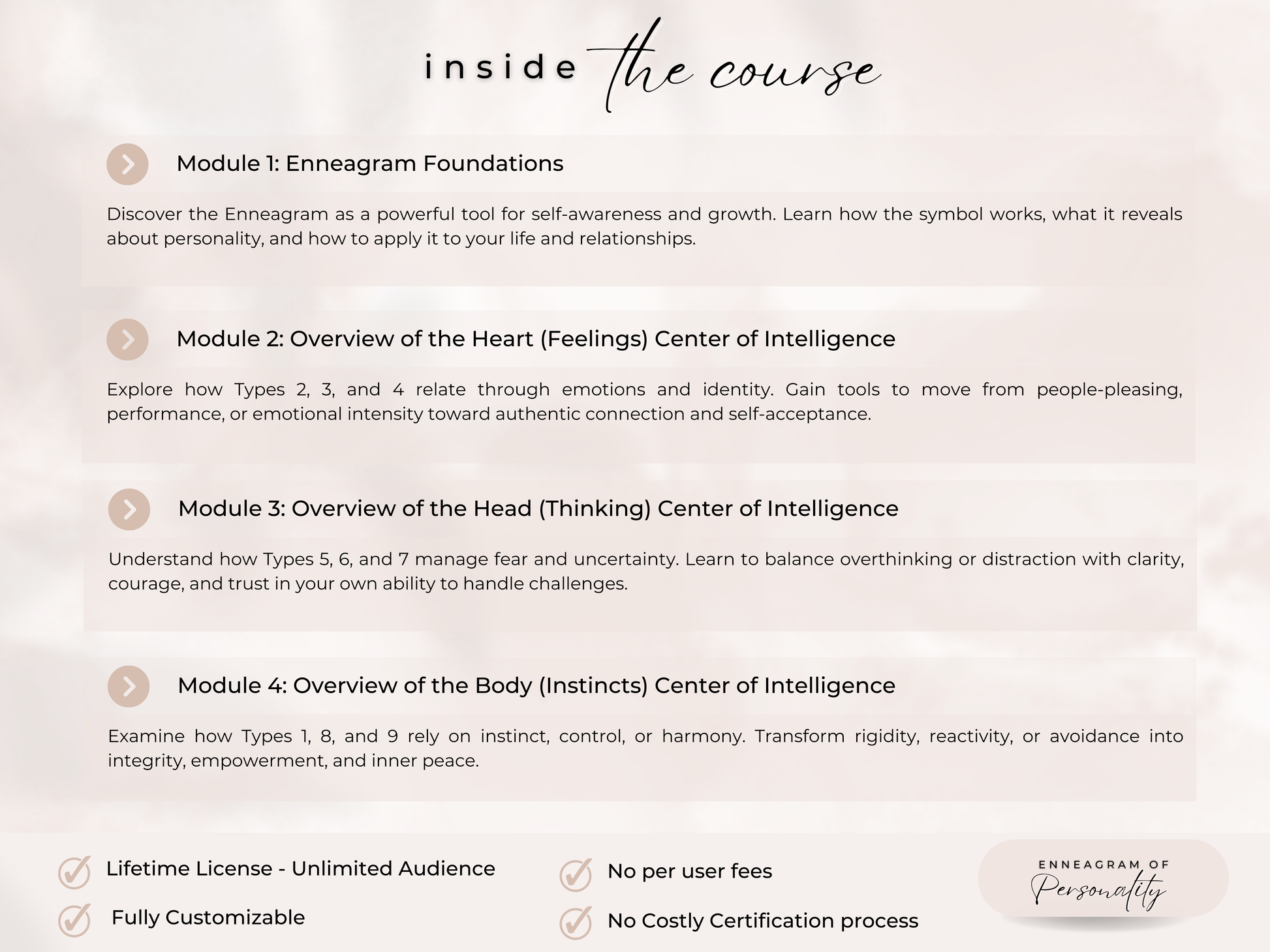 Perfect for personal development coaches, life coaches, and business mentors, this course includes fully customizable modules and worksheets, allowing you to seamlessly integrate them into your offerings.