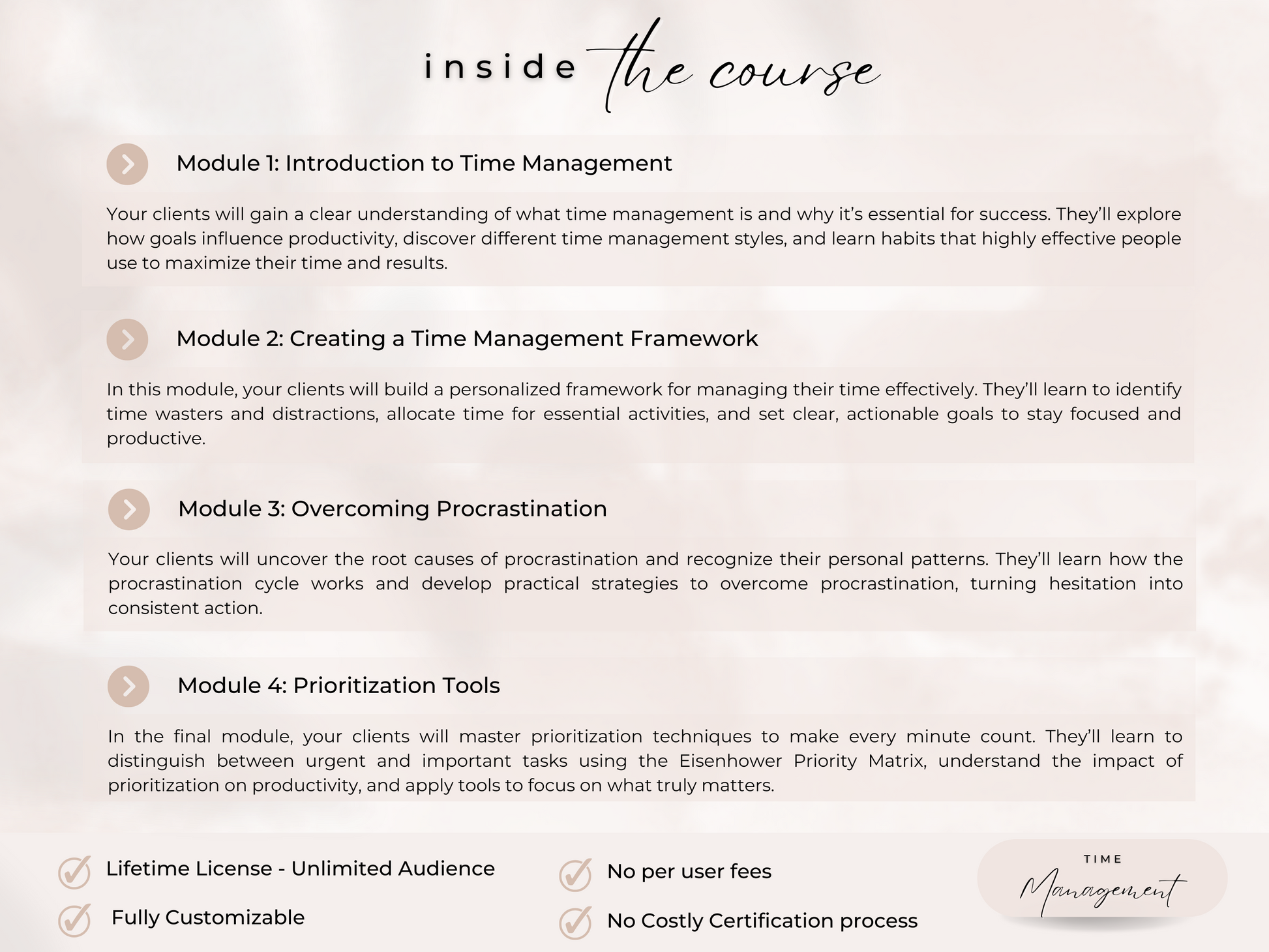 Empower your audience to take control of their time, boost productivity, and reduce stress with the Time Management PLR Course. This course is fully customizable and crafted specifically for coaches looking to add a valuable, time-saving resource to their offerings. Perfect for life coaches, business coaches, and productivity mentors, this course provides structured guidance, techniques, and exercises to help clients manage their time effectively and achieve their personal and professional goals.